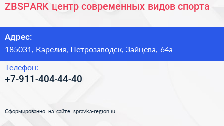 ZBSPARK, центр современных видов спорта по адресу 185031, Карелия, Петрозаводск, Зайцева, 64а в дальнейшем Организация, размещена в следующих категориях: