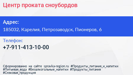 Центр проката сноубордов по адресу 185032, Карелия, Петрозаводск, Пионеров, 6 в дальнейшем Организация, размещена в следующих категориях: