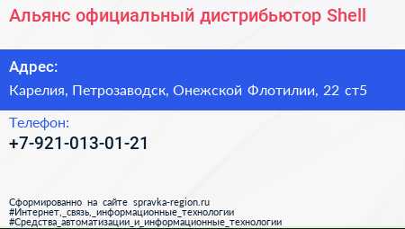 Альянс, официальный дистрибьютор Shell по адресу Карелия, Петрозаводск, Онежской Флотилии, 22 ст5 в дальнейшем Организация, размещена в следующих категориях: