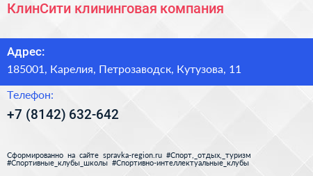 КлинСити, клининговая компания по адресу 185001, Карелия, Петрозаводск, Кутузова, 11 в дальнейшем Организация, размещена в следующих категориях: