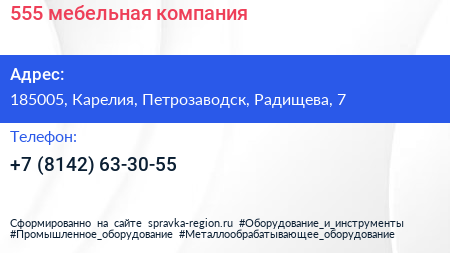555, мебельная компания по адресу 185005, Карелия, Петрозаводск, Радищева, 7 в дальнейшем Организация, размещена в следующих категориях: