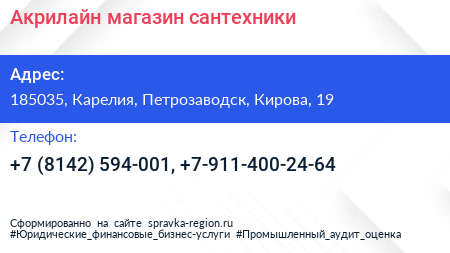 Акрилайн, магазин сантехники по адресу 185035, Карелия, Петрозаводск, Кирова, 19 в дальнейшем Организация, размещена в следующих категориях: