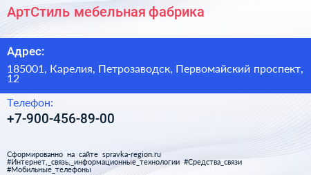 АртСтиль, мебельная фабрика по адресу 185001, Карелия, Петрозаводск, Первомайский проспект, 12 в дальнейшем Организация, размещена в следующих категориях: