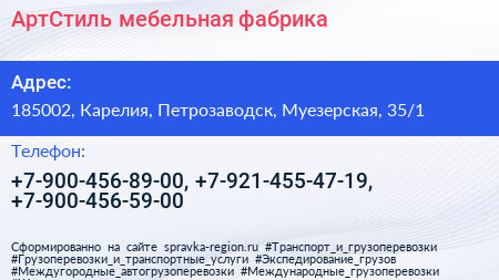 АртСтиль, мебельная фабрика по адресу 185002, Карелия, Петрозаводск, Муезерская, 35/1 в дальнейшем Организация, размещена в следующих категориях: