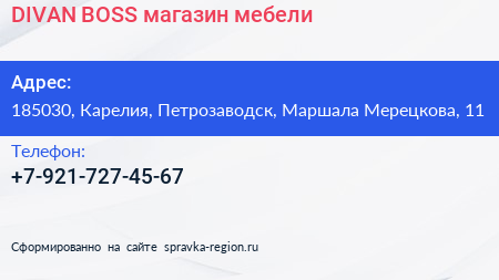 DIVAN BOSS, магазин мебели по адресу 185030, Карелия, Петрозаводск, Маршала Мерецкова, 11 в дальнейшем Организация, размещена в следующих категориях: