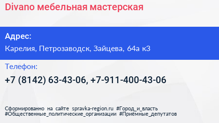 Divano, мебельная мастерская по адресу Карелия, Петрозаводск, Зайцева, 64а к3 в дальнейшем Организация, размещена в следующих категориях: