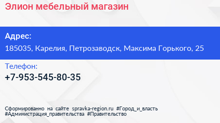 Элион, мебельный магазин по адресу 185035, Карелия, Петрозаводск, Максима Горького, 25 в дальнейшем Организация, размещена в следующих категориях: