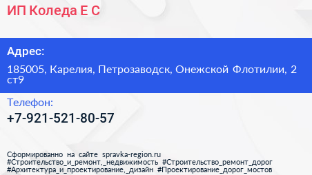 ИП Коледа Е.С. по адресу 185005, Карелия, Петрозаводск, Онежской Флотилии, 2 ст9 в дальнейшем Организация, размещена в следующих категориях: