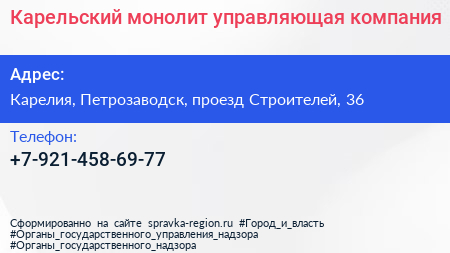 Карельский монолит, управляющая компания по адресу Карелия, Петрозаводск, проезд Строителей, 36 в дальнейшем Организация, размещена в следующих категориях: