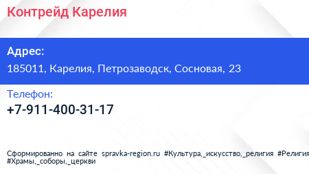 Контрейд Карелия по адресу 185011, Карелия, Петрозаводск, Сосновая, 23 в дальнейшем Организация, размещена в следующих категориях: