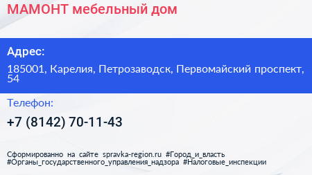 МАМОНТ, мебельный дом по адресу 185001, Карелия, Петрозаводск, Первомайский проспект, 54 в дальнейшем Организация, размещена в следующих категориях: