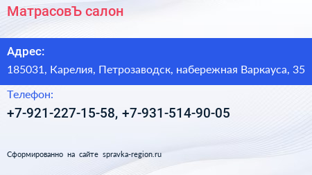 МатрасовЪ, салон по адресу 185031, Карелия, Петрозаводск, набережная Варкауса, 35 в дальнейшем Организация, размещена в следующих категориях:
