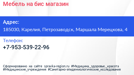 Мебель на бис, магазин по адресу 185030, Карелия, Петрозаводск, Маршала Мерецкова, 4 в дальнейшем Организация, размещена в следующих категориях: