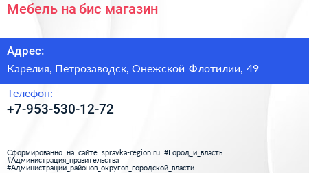 Мебель на бис, магазин по адресу Карелия, Петрозаводск, Онежской Флотилии, 49 в дальнейшем Организация, размещена в следующих категориях: