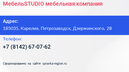 МебельSTUDIO, мебельная компания по адресу 185035, Карелия, Петрозаводск, Дзержинского, 28 в дальнейшем Организация, размещена в следующих категориях: