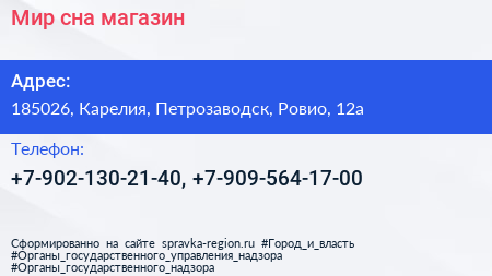 Мир сна, магазин по адресу 185026, Карелия, Петрозаводск, Ровио, 12а в дальнейшем Организация, размещена в следующих категориях: