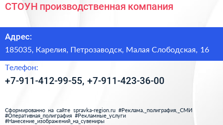 СТОУН, производственная компания по адресу 185035, Карелия, Петрозаводск, Малая Слободская, 16 в дальнейшем Организация, размещена в следующих категориях: