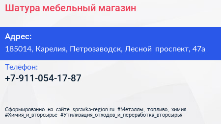 Шатура, мебельный магазин по адресу 185014, Карелия, Петрозаводск, Лесной проспект, 47а в дальнейшем Организация, размещена в следующих категориях: