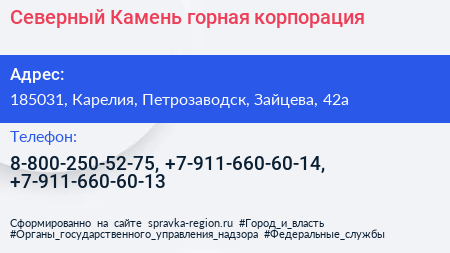 Северный Камень, горная корпорация по адресу 185031, Карелия, Петрозаводск, Зайцева, 42а в дальнейшем Организация, размещена в следующих категориях: