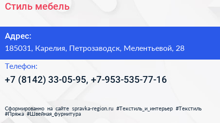 Стиль мебель по адресу 185031, Карелия, Петрозаводск, Мелентьевой, 28 в дальнейшем Организация, размещена в следующих категориях: