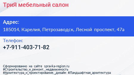 ТриЯ, мебельный салон по адресу 185014, Карелия, Петрозаводск, Лесной проспект, 47а в дальнейшем Организация, размещена в следующих категориях: