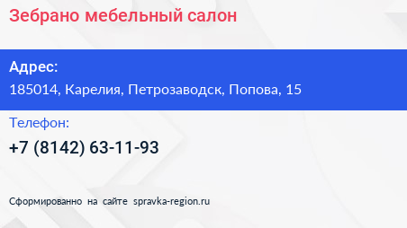 Зебрано, мебельный салон по адресу 185014, Карелия, Петрозаводск, Попова, 15 в дальнейшем Организация, размещена в следующих категориях: