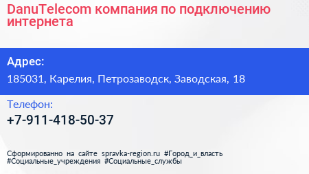 DanuTelecom, компания по подключению интернета по адресу 185031, Карелия, Петрозаводск, Заводская, 18 в дальнейшем Организация, размещена в следующих категориях: