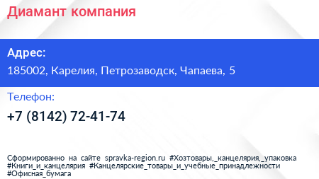 Диамант, компания по адресу 185002, Карелия, Петрозаводск, Чапаева, 5 в дальнейшем Организация, размещена в следующих категориях:
