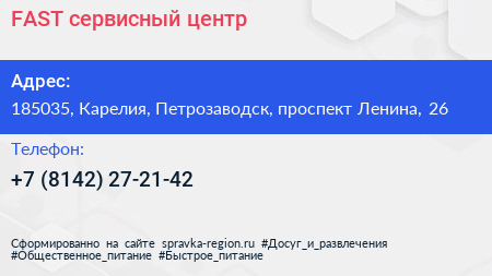 FAST, сервисный центр по адресу 185035, Карелия, Петрозаводск, проспект Ленина, 26 в дальнейшем Организация, размещена в следующих категориях: