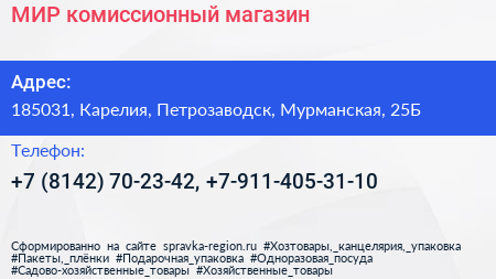 МИР, комиссионный магазин по адресу 185031, Карелия, Петрозаводск, Мурманская, 25Б в дальнейшем Организация, размещена в следующих категориях: