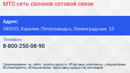 МТС, сеть салонов сотовой связи по адресу 185035, Карелия, Петрозаводск, Ленинградская, 13 в дальнейшем Организация, размещена в следующих категориях: