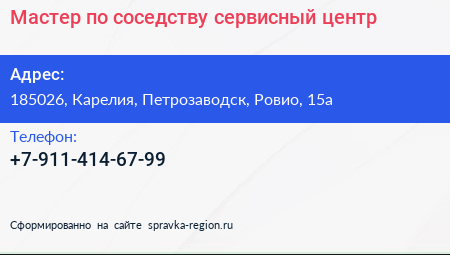 Мастер по соседству, сервисный центр по адресу 185026, Карелия, Петрозаводск, Ровио, 15а в дальнейшем Организация, размещена в следующих категориях: