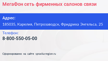 МегаФон, сеть фирменных салонов связи по адресу 185035, Карелия, Петрозаводск, Фридриха Энгельса, 25 в дальнейшем Организация, размещена в следующих категориях: