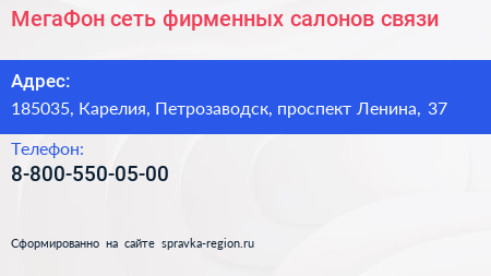 МегаФон, сеть фирменных салонов связи по адресу 185035, Карелия, Петрозаводск, проспект Ленина, 37 в дальнейшем Организация, размещена в следующих категориях: