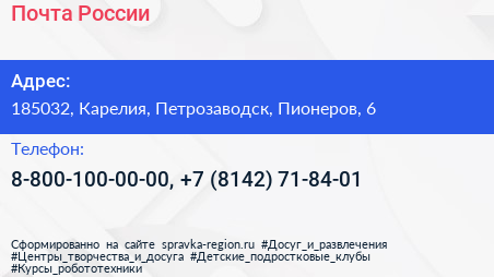 Почта России по адресу 185032, Карелия, Петрозаводск, Пионеров, 6 в дальнейшем Организация, размещена в следующих категориях: