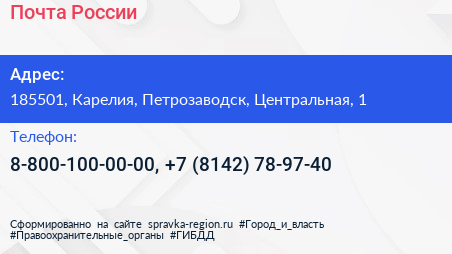 Почта России по адресу 185501, Карелия, Петрозаводск, Центральная, 1 в дальнейшем Организация, размещена в следующих категориях: