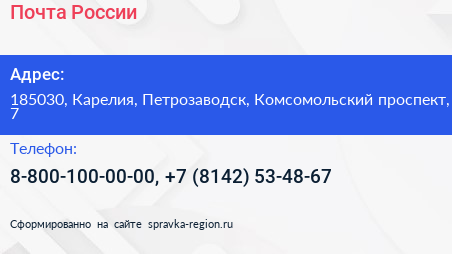 Почта России по адресу 185030, Карелия, Петрозаводск, Комсомольский проспект, 7 в дальнейшем Организация, размещена в следующих категориях: