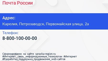 Почта России по адресу Карелия, Петрозаводск, Первомайская улица, 2а в дальнейшем Организация, размещена в следующих категориях: