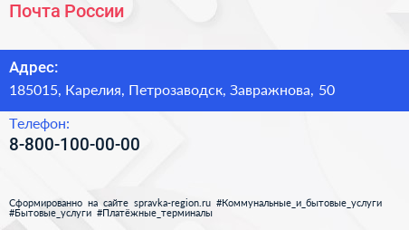 Почта России по адресу 185015, Карелия, Петрозаводск, Завражнова, 50 в дальнейшем Организация, размещена в следующих категориях: