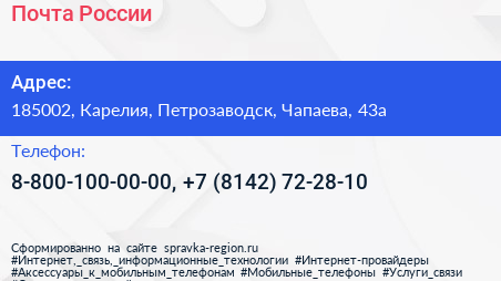 Почта России по адресу 185002, Карелия, Петрозаводск, Чапаева, 43а в дальнейшем Организация, размещена в следующих категориях: