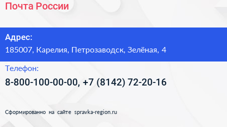 Почта России по адресу 185007, Карелия, Петрозаводск, Зелёная, 4 в дальнейшем Организация, размещена в следующих категориях:
