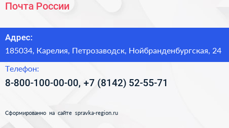 Почта России по адресу 185034, Карелия, Петрозаводск, Нойбранденбургская, 24 в дальнейшем Организация, размещена в следующих категориях: