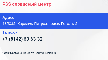 RSS, сервисный центр по адресу 185035, Карелия, Петрозаводск, Гоголя, 5 в дальнейшем Организация, размещена в следующих категориях:
