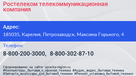 Ростелеком, телекоммуникационная компания по адресу 185035, Карелия, Петрозаводск, Максима Горького, 4 в дальнейшем Организация, размещена в следующих категориях: