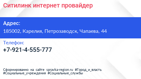 Ситилинк, интернет-провайдер по адресу 185002, Карелия, Петрозаводск, Чапаева, 44 в дальнейшем Организация, размещена в следующих категориях: