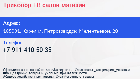 Триколор ТВ, салон-магазин по адресу 185031, Карелия, Петрозаводск, Мелентьевой, 28 в дальнейшем Организация, размещена в следующих категориях: