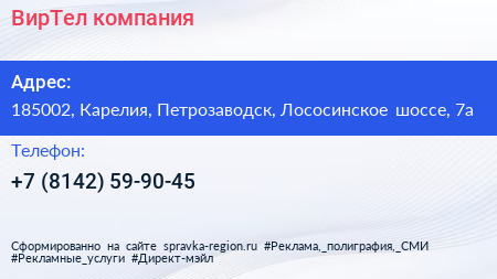 ВирТел, компания по адресу 185002, Карелия, Петрозаводск, Лососинское шоссе, 7а в дальнейшем Организация, размещена в следующих категориях: