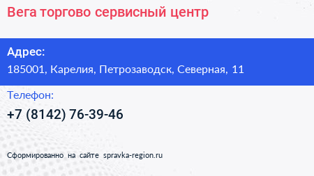 Вега, торгово-сервисный центр по адресу 185001, Карелия, Петрозаводск, Северная, 11 в дальнейшем Организация, размещена в следующих категориях: