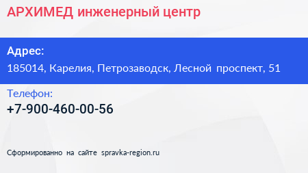 АРХИМЕД, инженерный центр по адресу 185014, Карелия, Петрозаводск, Лесной проспект, 51 в дальнейшем Организация, размещена в следующих категориях: