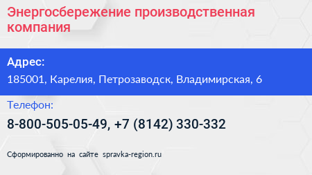 Энергосбережение, производственная компания по адресу 185001, Карелия, Петрозаводск, Владимирская, 6 в дальнейшем Организация, размещена в следующих категориях: